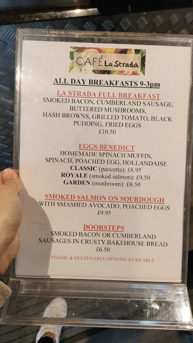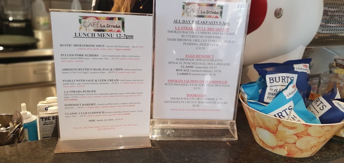 Cafe La Strada offers a delightful menu with a variety of dishes and drinks, catering to a wide range of tastes throughout the day. For breakfast lovers, La Strada Full Breakfast is a standout option, perfect for a hearty start to the day. The lunch menu features a delicious assortment, including Curried Parsnip Soup, a warm and flavorful option, and the Greek Style Lamb Burger, which brings a Mediterranean twist to a classic. If you're in the mood for something more indulgent, the New York Hot Dog is a great choice, while the Pulled Lamb with Moroccan Cous Cous offers a rich, exotic flavor. For a taste of local tradition, try the Somerset Rarebit, a comforting dish with a distinctive British flair.